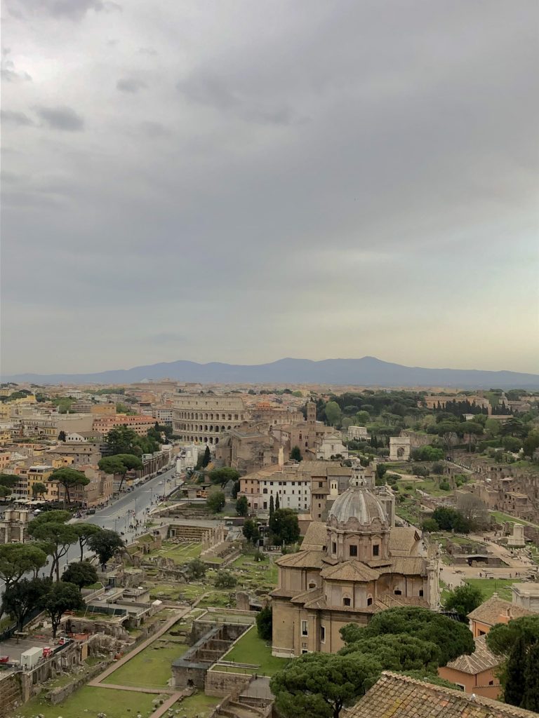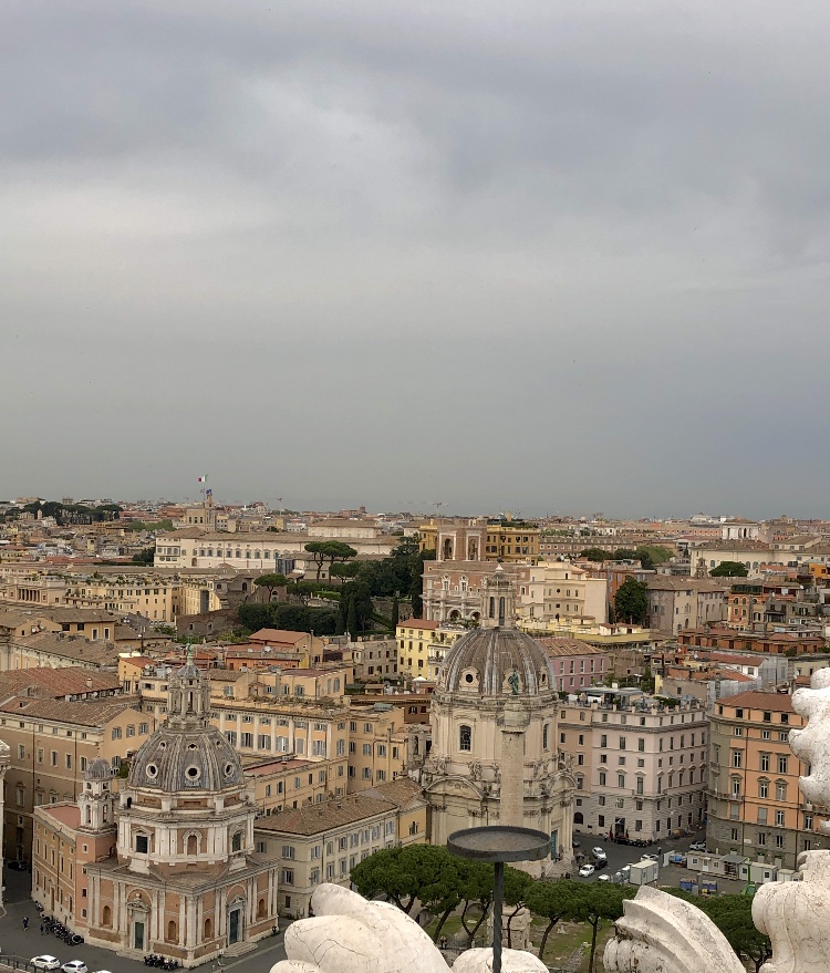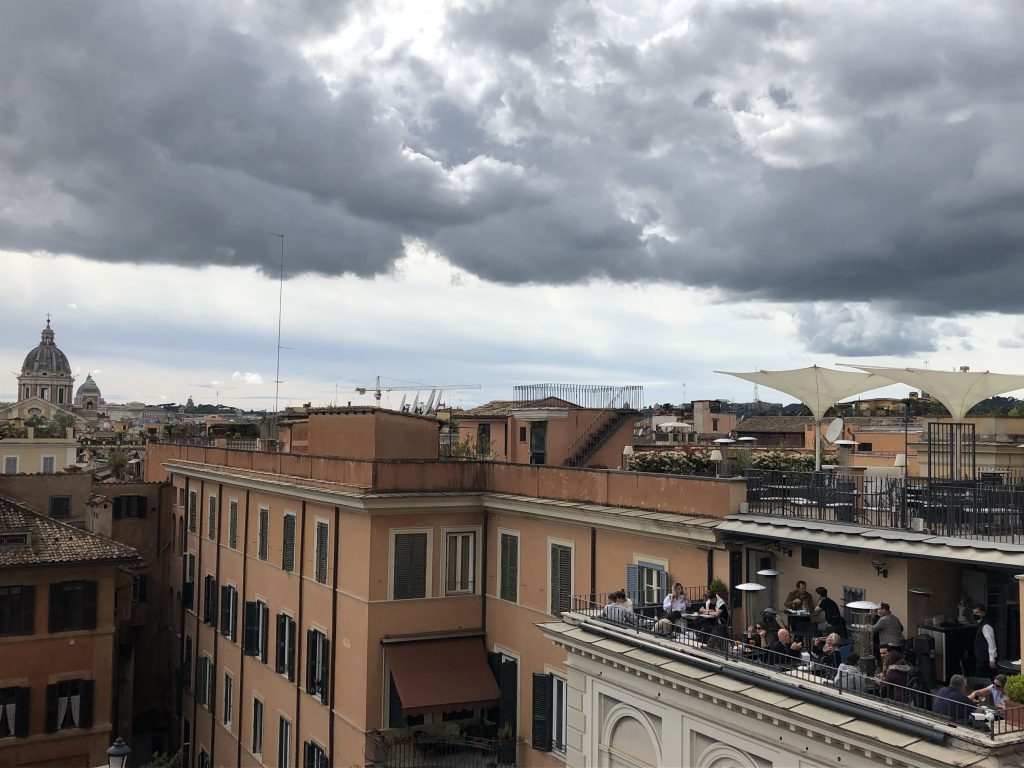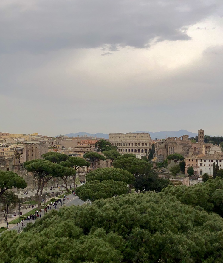 Montez jusqu’à la terrasse panoramique pour admirer une vue à couper le souffle sur Rome, même par temps de pluie. Les nuages donnent une atmosphère encore plus mystique à la ville.