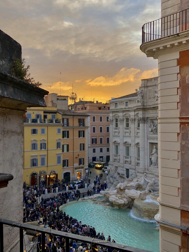 💖 Pour terminer cette journée en beauté, vivez une expérience inoubliable et rendez-vous au Rooftop Lounge Trevi au moment du coucher du soleil !! C’est un bar-restaurant assez peu connu (pour son emplacement) et qui donne une vue imprenable sur la Fontaine de Trevi ! Les prix sont un peu plus chers mais pas exagérés selon nous ; nous avons pris deux boissons et un plat à partager pour 30€ environ. Cependant attendez-vous à attendre un peu (20min) avant d’avoir une table disponible, et pensez à réserver bien en avance si vous voulez avoir l’une des rares table faisant face à la fontaine.